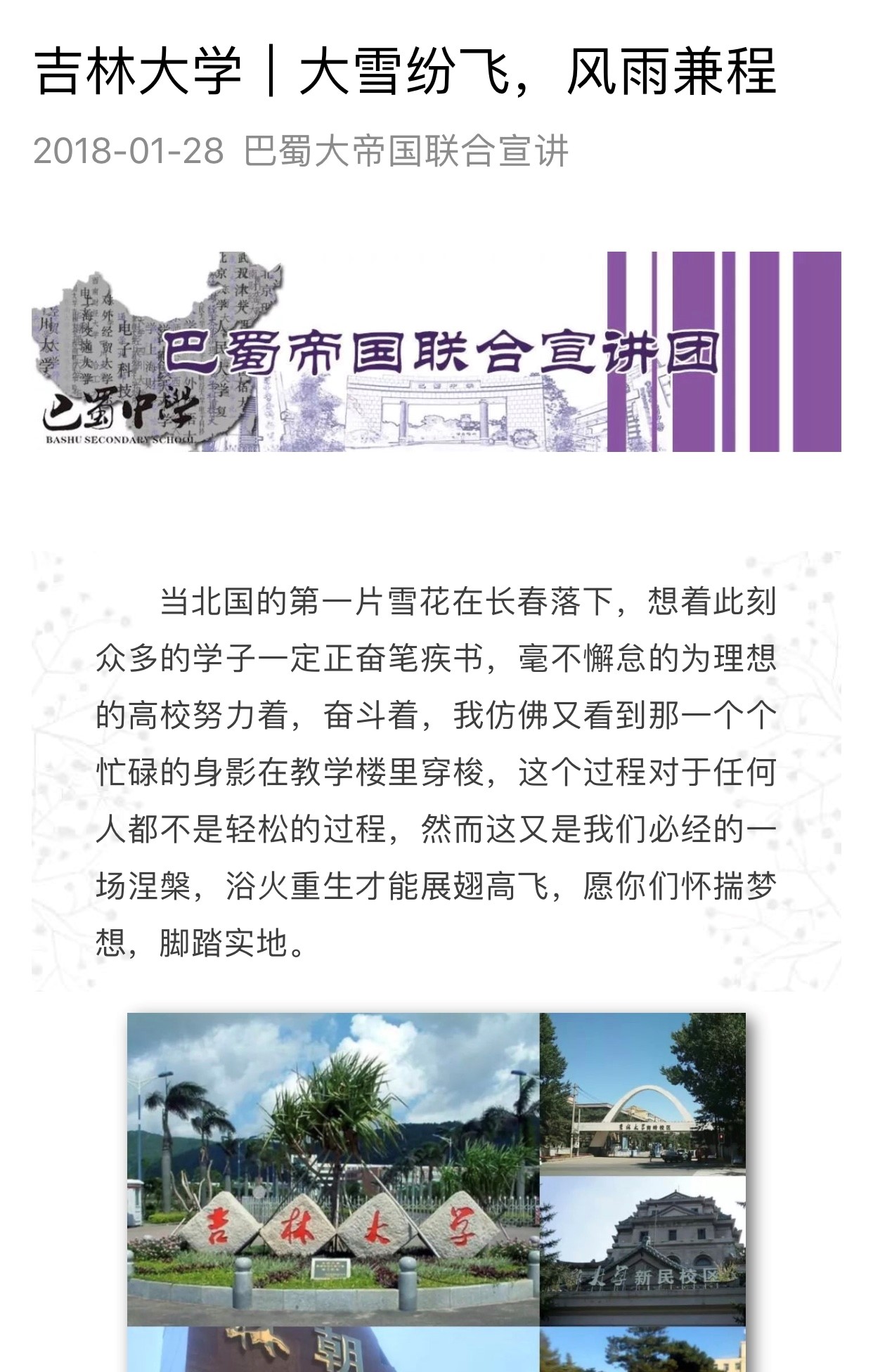 经过四个阶段的宣讲,我们圆满完成了本次宣讲活动。我们相信学弟学妹们及家长朋友们对万象城体育awcsport有了更加深入的了解,并在半年后的志愿填报中体现本次宣讲活动的成效。愿学弟学妹们考场上合上笔盖那一刻,如战士收刀入鞘。愿吉大学子求实创新,励志图强。