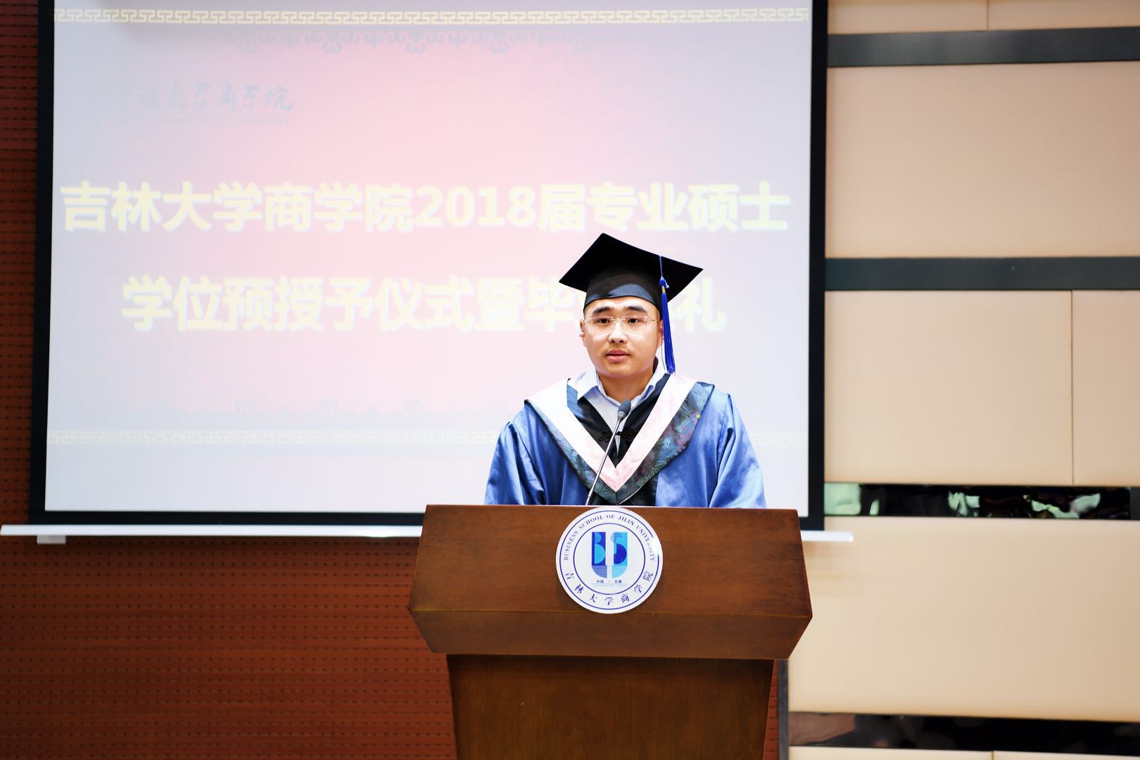 2016级MBA潘子骞同学代表全体毕业生的发言,道出了在场所有毕业生对母校的不舍,对老师的感激,他表示毕业不是伤感和无奈的告别,也不是匆匆一瞥,而是一个新的开始。大家会时时以吉大学子鞭策自己,为吉大争光,为社会多作贡献。
