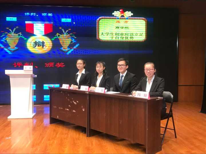 辩论赛由刘泽霄,王舒瑶,王伟业,王宇四位同学分别担任一二三四辩辩手。赛前,商院辩论队同学通力合作,共同讨论辩题,制定完善的应战策略。从反方大学生的自身优势出发,找到本方的优势之处,同时思考正方代表队的优势点,逐一分析,对反正方代表队可能的辩论材料做了充分的考虑。赛上,同学们沉着冷静,积极应变,条理清晰,充分展现了商院辩论队的风采。