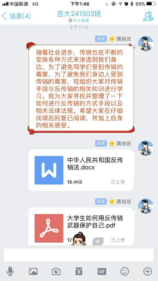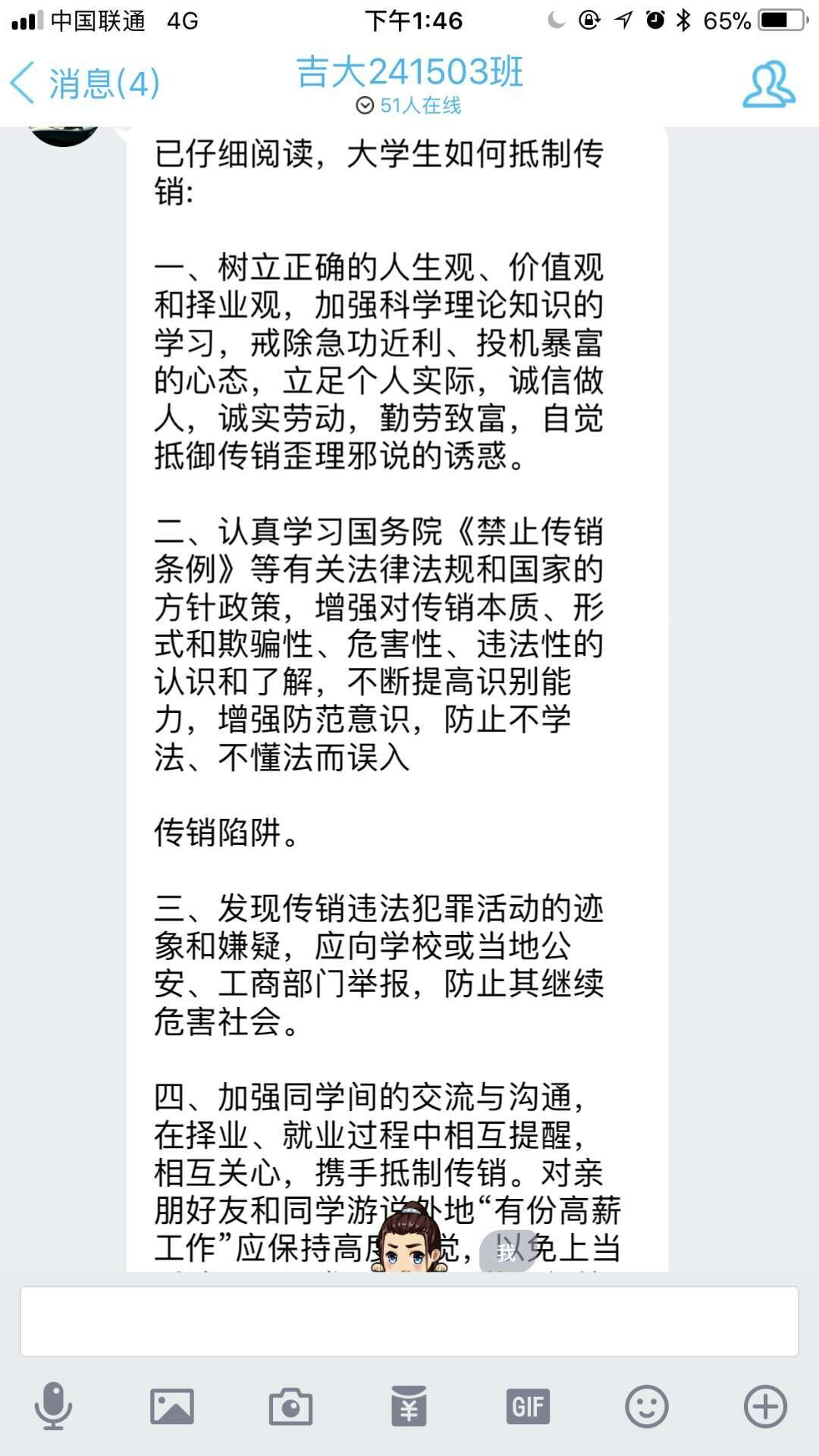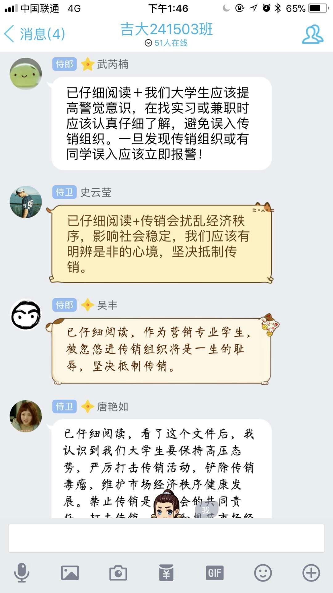 各班级分别从“如何识别传销陷阱”、“大学生如何用反传销武器保护自己”等方面向同学们进行了宣传与普及,各班在班群里都发布了《中华人民共和国反传销法》以供同学们学习。这次的宣传活动引起了2015级各班同学对于传销组织的高度警惕,同学们反应强烈,积极学习并在交流群中发表内心的感想与学习感悟,同时还有同学表示要将反传销工作做出校园,要向家人普及传销组织的危害性,防止传销组织危害到家人的生命。