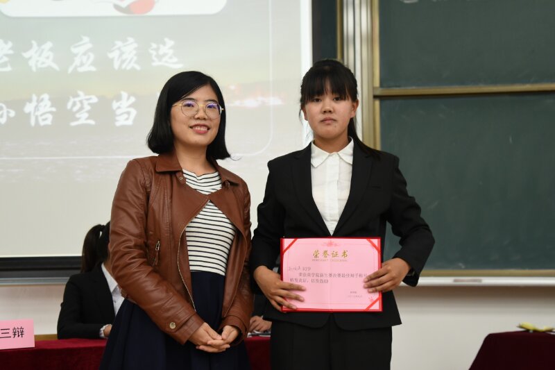 最终,在一个小时的激烈辩论后,正方取得了胜利,反方一辩获得了最佳辩手的称号,王雨菲学姐为其颁奖。