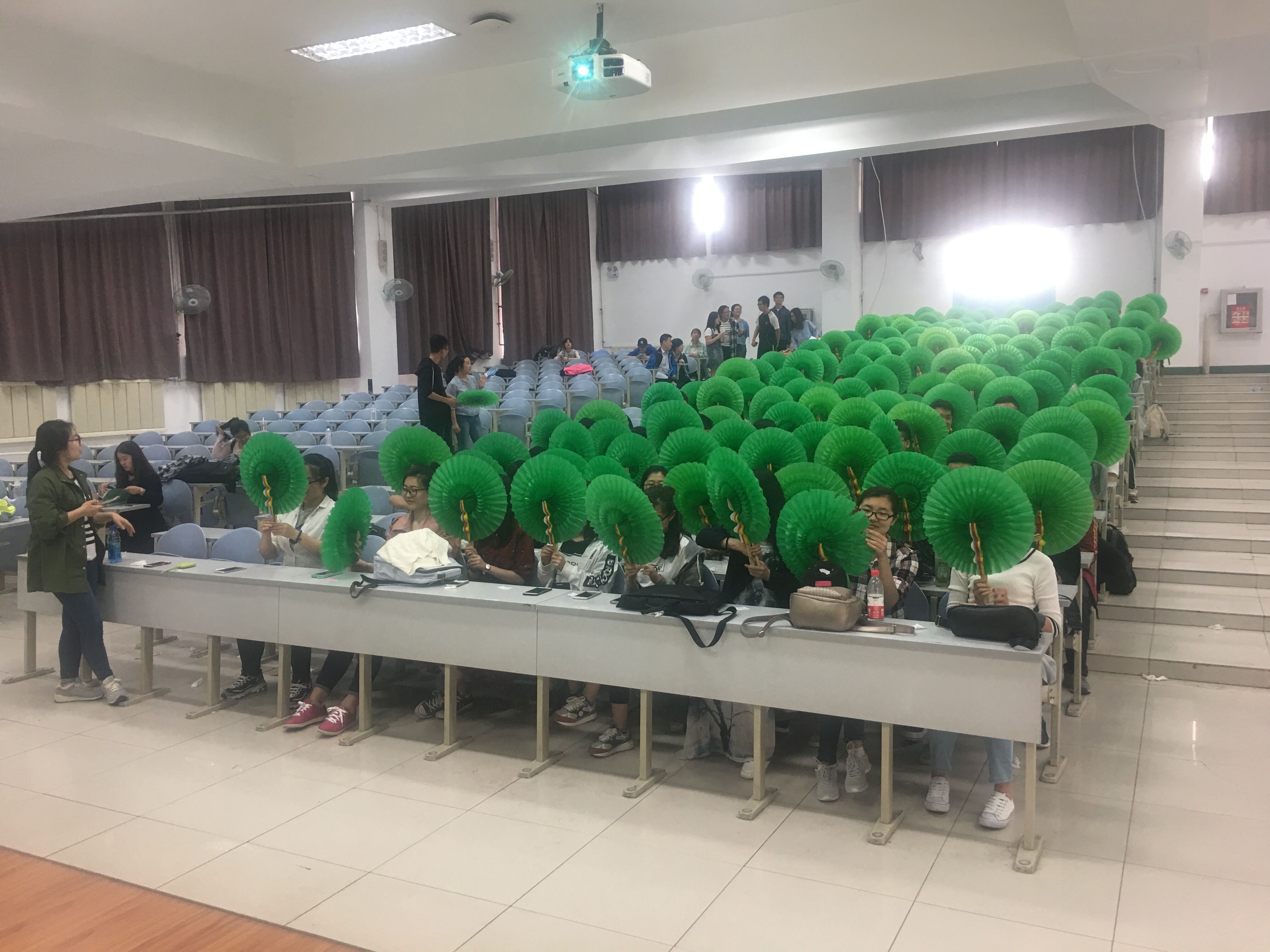 5月11日下午,为了迎接即将到来的校运动会,作为观众的同学在三教阶梯教室展开训练。