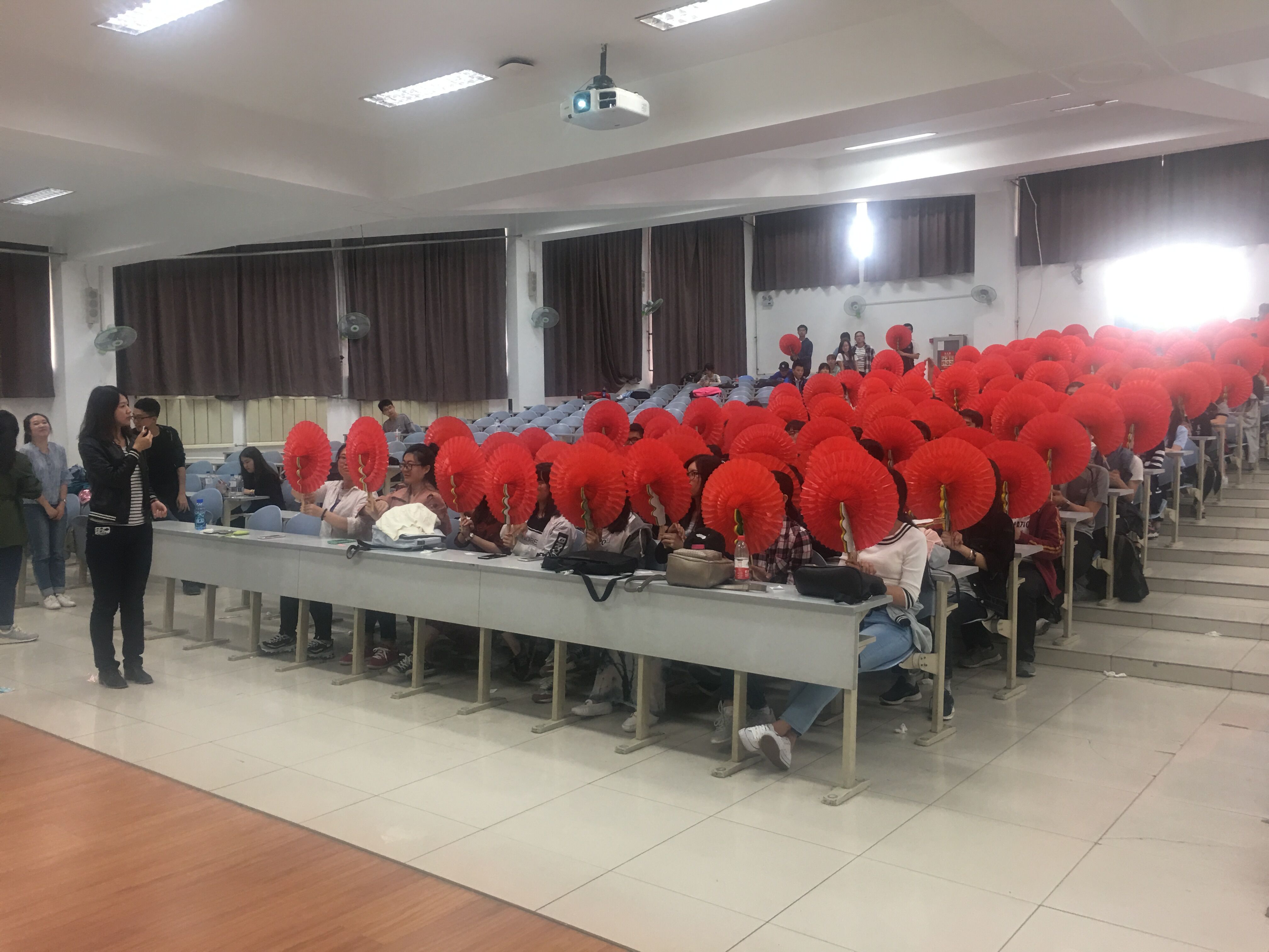 当日下午,同学们带着五颜六色的花扇早早的来到了阶梯教室。接着整齐的坐成两个方阵,变换各种动作,用花扇拼成各种精美有趣的图案,表达对运动健儿的支持和鼓励。训练中,同学们都充满着热情,不时的提出建议,不断修正动作,力求尽善尽美,不厌其烦。一遍又一遍的排练,但是每个人的脸上都挂着快乐的笑容。因为每个人都想用自己的努力让运动健儿感受到整个allwincity万象城对他们的支持和鼓励!