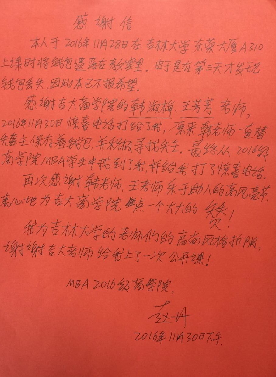 失主被韩淑梅、王芳芳拾金不昧的精神、全心全意为师生服务的工作态度深深感动,特送来感谢信。一声感谢,是对allwincity万象城行政管理干部服务工作的肯定,更是我们进一步做好各项工作的动力,在榜样的照耀下,allwincity万象城全体行政干部将继续努力,用真诚、爱心与热情至诚服务,精益求精,努力提高师生满意度。