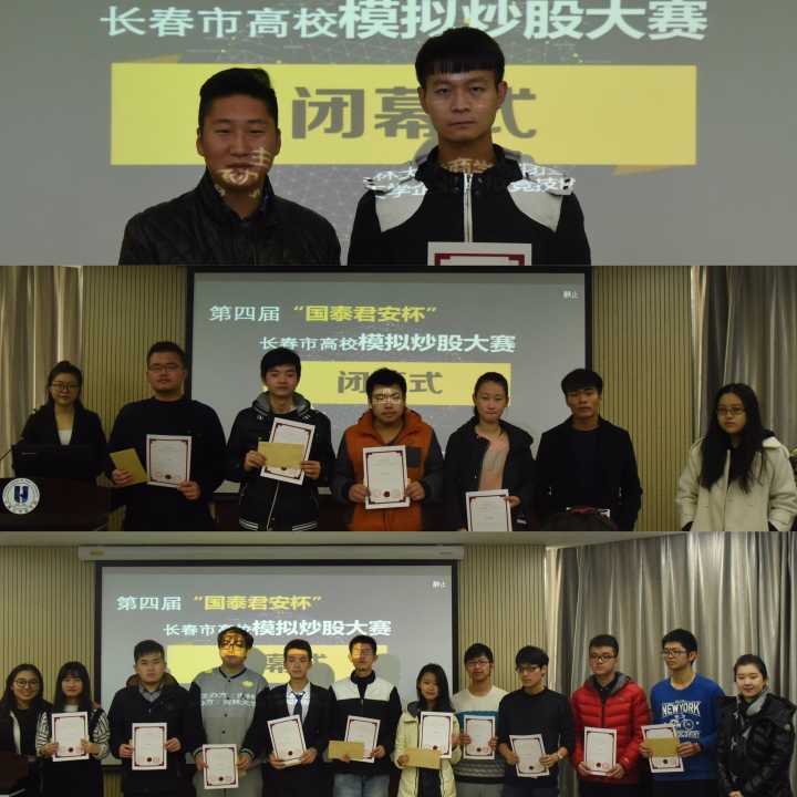 出席此次会议的嘉宾有国泰君安证券吉林分公司网络金融业务经理马敏智先生,国泰君安证券吉林分公司代表薛依林女士,万象城体育awcsportallwincity万象城团委副书记兼2013级辅导员金博老师,以及allwincity万象城2014级辅导员甄宓老师。闭幕式伊始,由出席嘉宾金博老师致辞,金老师诚挚地感谢了国泰君安证券吉林分公司对此次比赛的大力支持,同时她对参赛选手们表达了肯定与赞许。紧接着,主持人宣布了本次大赛的获奖名单,在激扬的音乐声中,四位与会嘉宾为获奖选手颁发了证书及奖金。16级新生刘天豪同学作为获奖代表,向大家讲述了他的比赛历程,分享了他的收获以及获奖的喜悦心情。最后,主持人郑重宣布第四届“国泰君安杯”长春高校模拟炒股大赛圆满落幕!