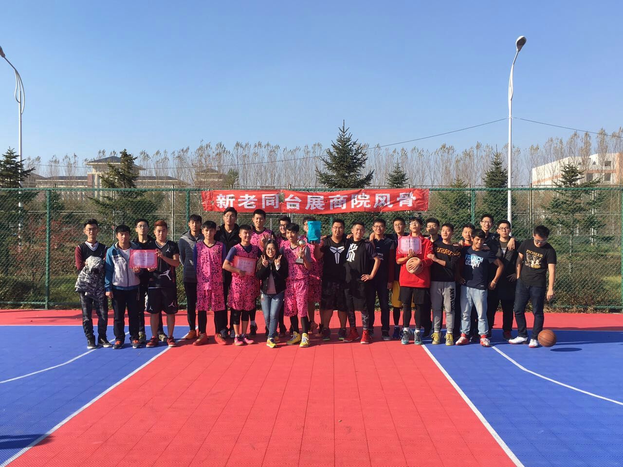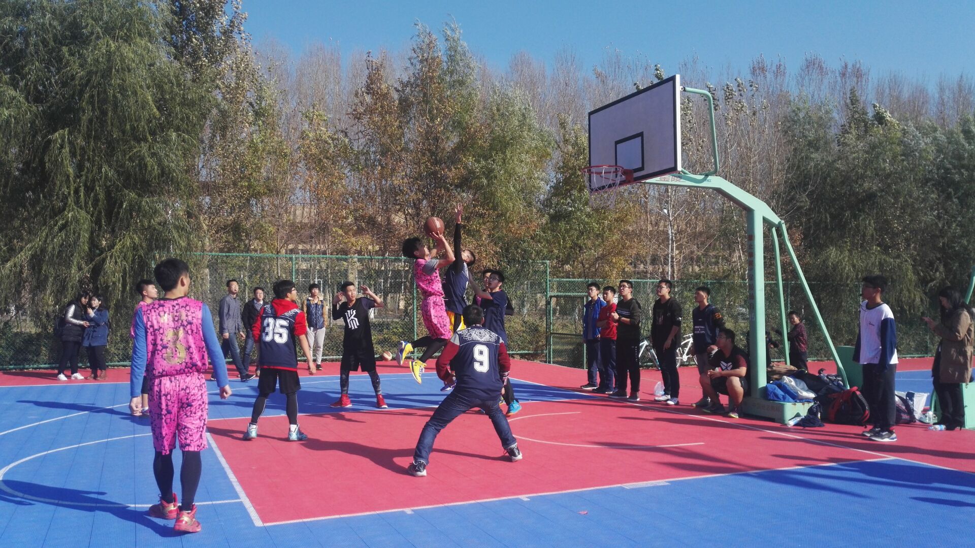 比赛开始之前,篮球场就已经被同学们围了起来。寒冷也无法抑制大家的热情。参加比赛的队员们更是热情高涨,跃跃欲试。