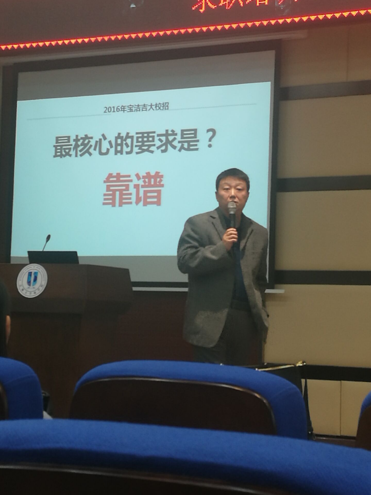 然后,王总举了几个知名公司招聘时给应聘者出的考题。如海尔公司的愚公移山的问题以及谷歌的称苹果难题等。最令人吃惊的是,宝洁公司在我校招聘所要求应聘者具备的核心品质是:靠谱。原来在那天应聘有多名求职者缺席,而且连招呼都不打。