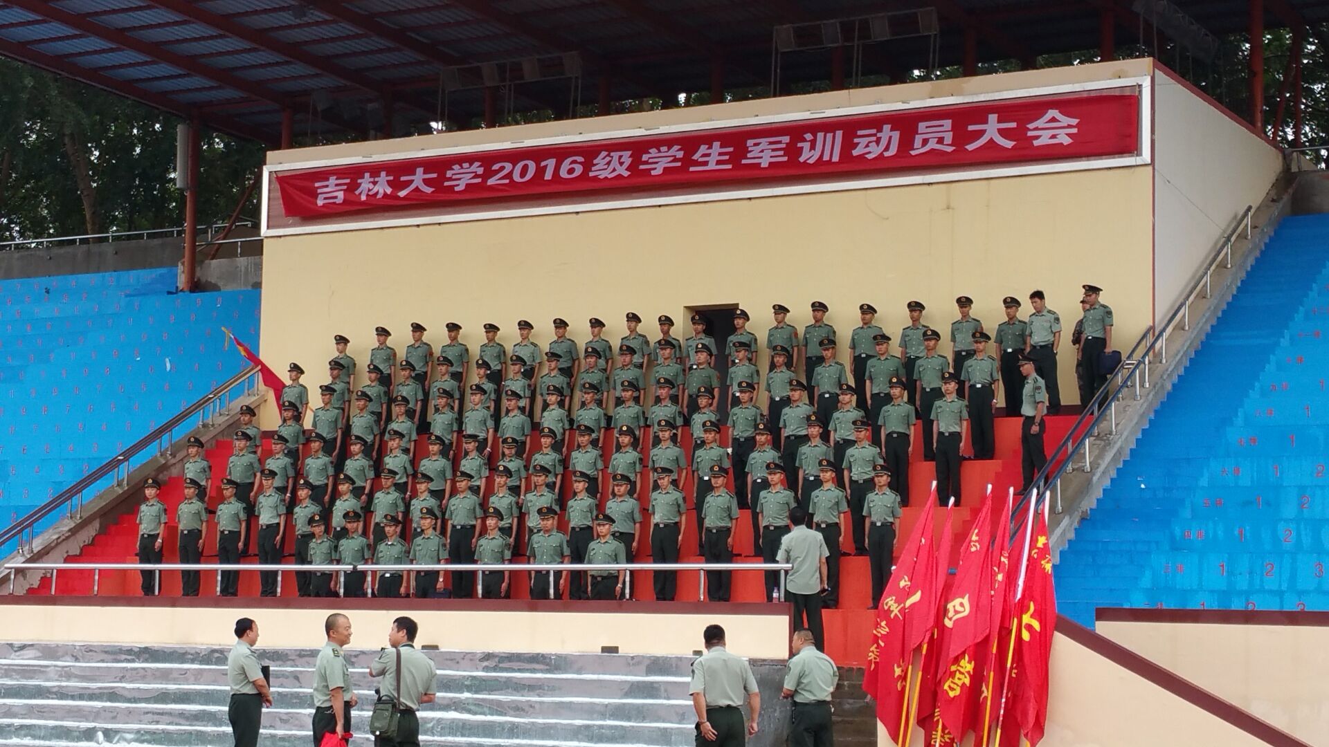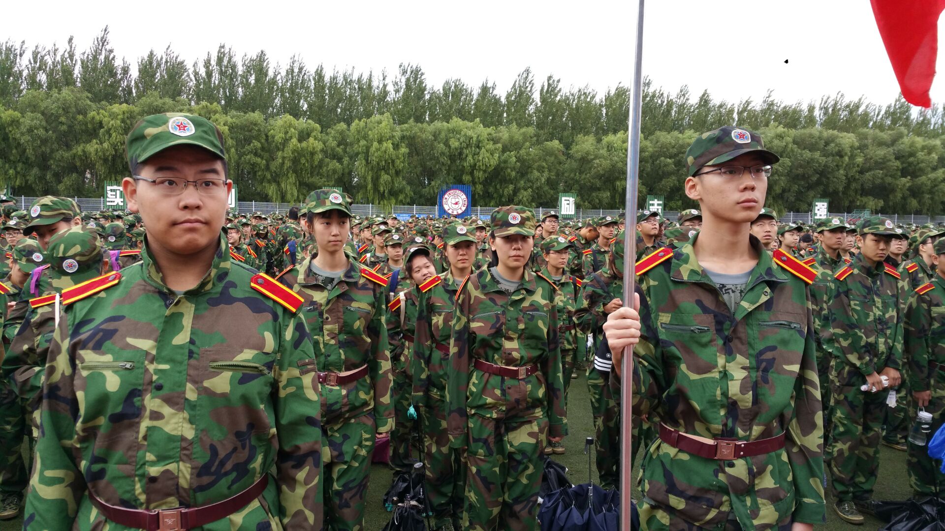 在进行升国旗奏国歌环节之后,依次由教官代表和新生代表发言讲话,最后在解放军军歌之中结束了本次新生动员大会。随后由各连教官带新生到各自的训练地进行第一天的正式训练。