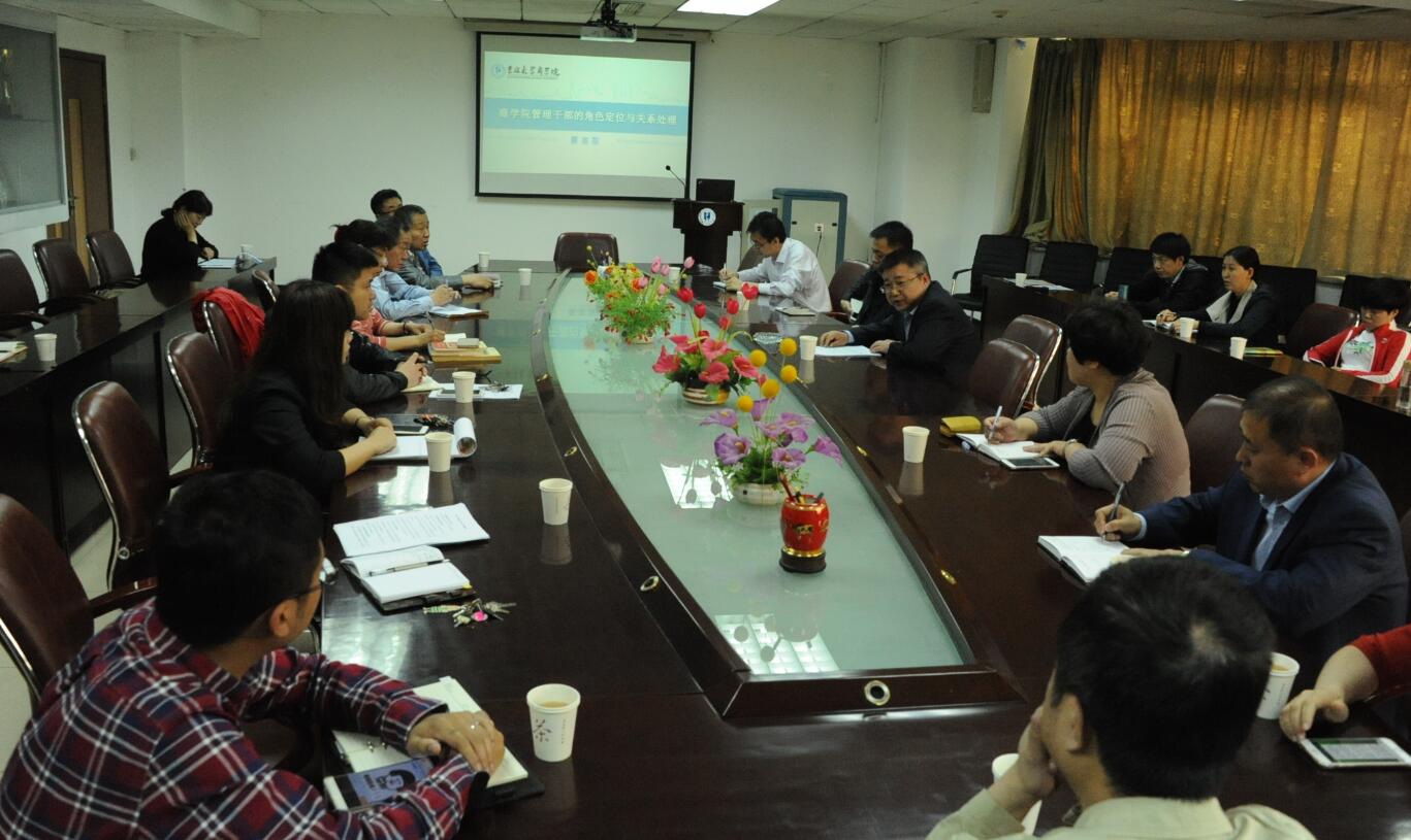 2016年5月25日上午,allwincity万象城管理干部培训在东荣大厦306会议室顺利举行。学院党委书记蔡志刚为全体行政管理干部进行了题为“管理干部的角色定位与关系处理”讲座。