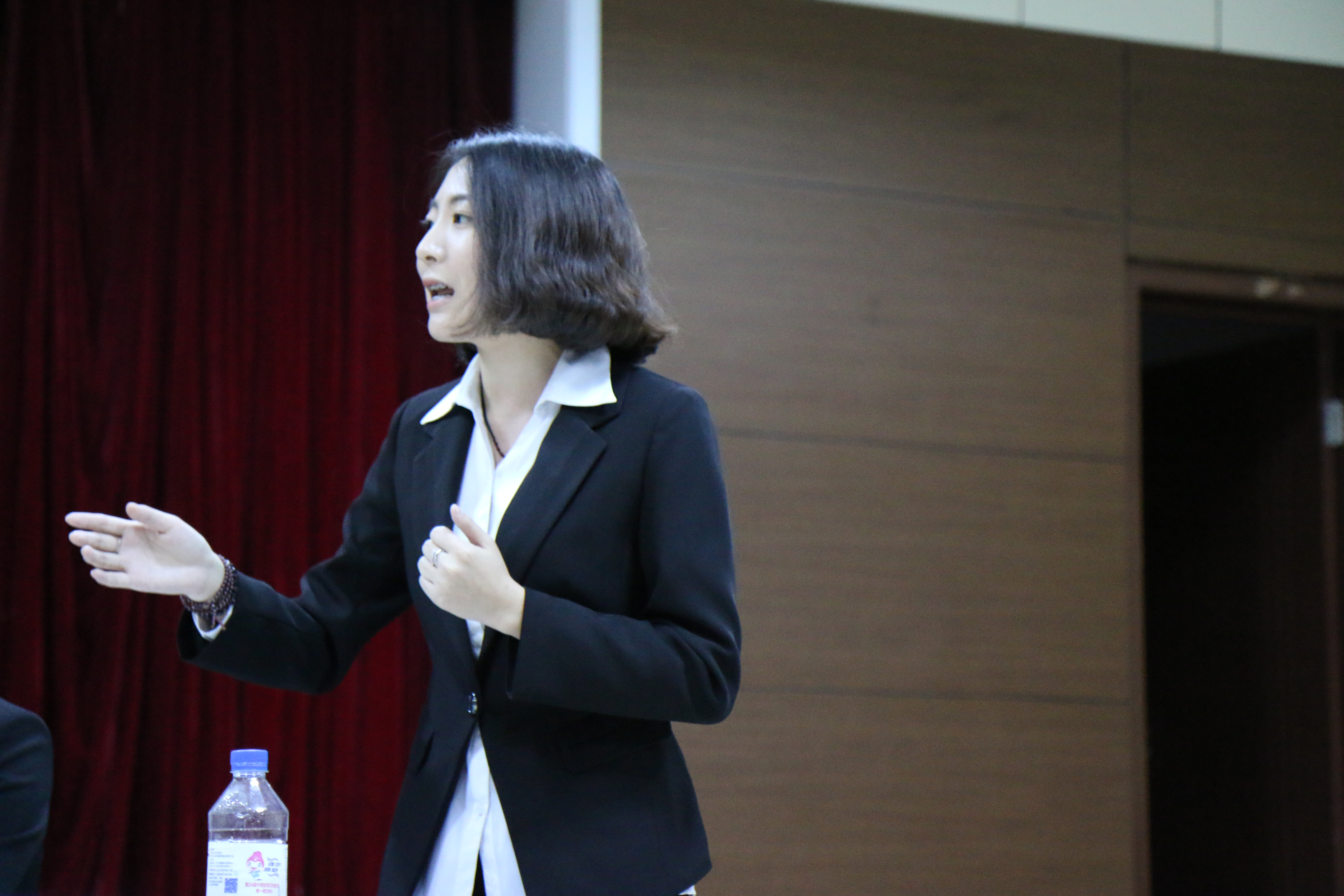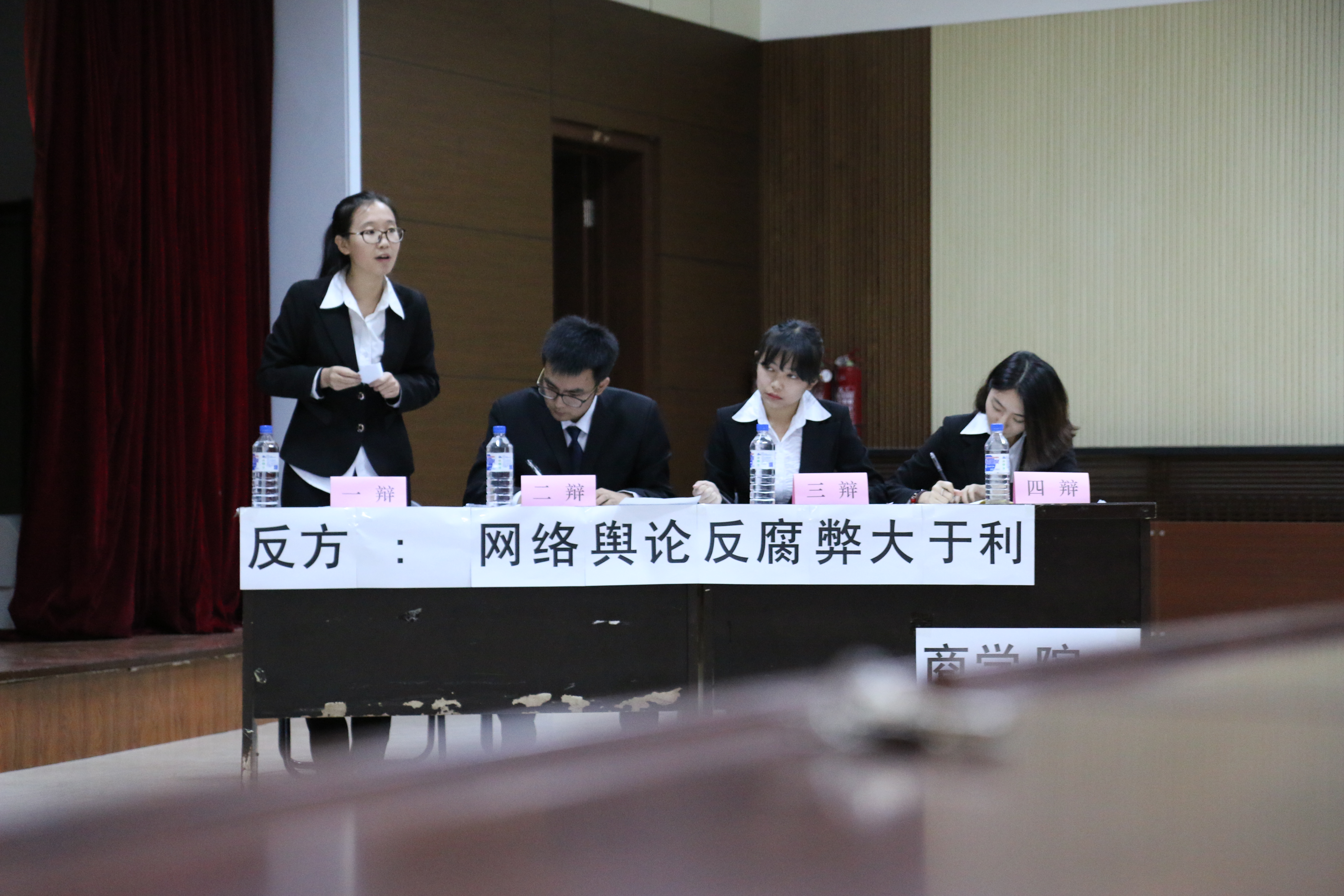 我方由高上、郭君龙、李瑶、赵雪彤四位同学分别担任一二三四辩辩手。比赛伊始,经过正方一辩论述后,我方四辩赵雪彤紧抓对方要害,以犀利的问题进行质询,每个问题都掷地有声。而面对正方四辩咄咄逼人的质询,我方一辩高上从容不迫地回答对方的问题。随后进入双方二辩补论阶段,我方二辩郭君龙有条不紊充分利用三分钟论述时间阐述自己的观点。此后再经过双方三辨例行小结,比赛进入到最激动人心的自由辩论环节。我方四位辩手配合得当,起落有序,提问利索直切要点,回答干练不失风度。最后,我方四辩赵雪彤声情并茂地进行总结陈词,待正方四辩陈词结束后,台下五位评委退场公议。