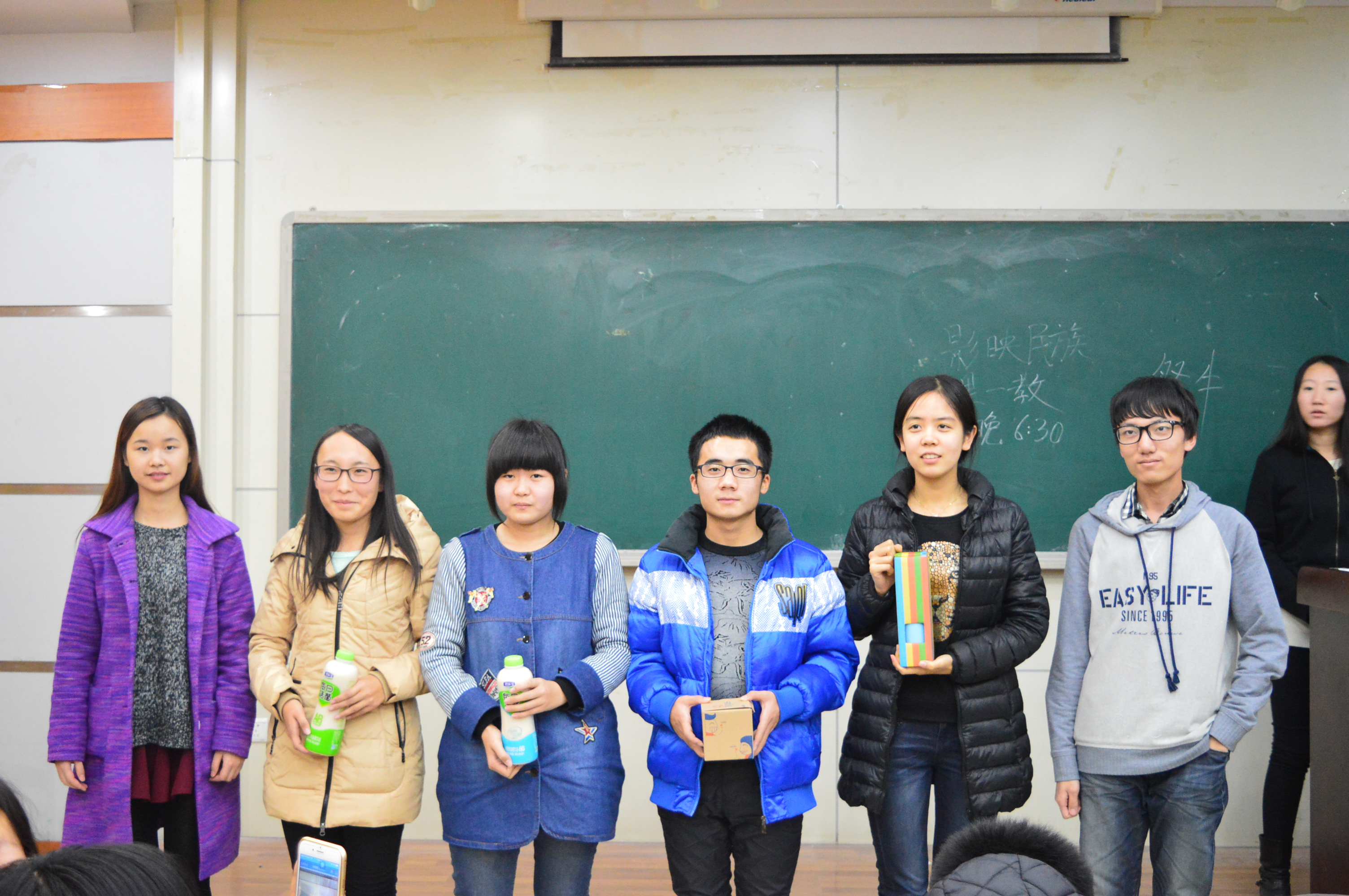 大赛的第一个环节是分组提问,选手们分成十一个组,每组两人,按顺序接受主持人的提问。问题都与少数民族的基本知识有关,如:“我国各民族主要分布的特点是什么”等等。期间由记分人员根据选手答对问题的个数记录相应的分数。紧张的分组提问环节过后,到了激动人心的抢答环节。主持人提问大家有关少数民族风俗文化的问题,选手们都积极参与,踊跃举手,就连台下观众也情不自禁加入其中,赛场气氛紧张热闹。不知不觉中,第二个环节很快就结束了,大赛进行到了最后一个环节,即每个组派出一个代表,介绍自己的家乡。同学们介绍了哈尔滨、新疆等地的风土人情,让我们领略到了来自祖国各地的美好文化,感受到了各个民族的精神风貌。最后,由评委评分,在场工作人员记分,根据总分的高低评比出了本次大赛的第一名和第二名,两组获奖选手分别手持奖品合影留念,大赛圆满结束。