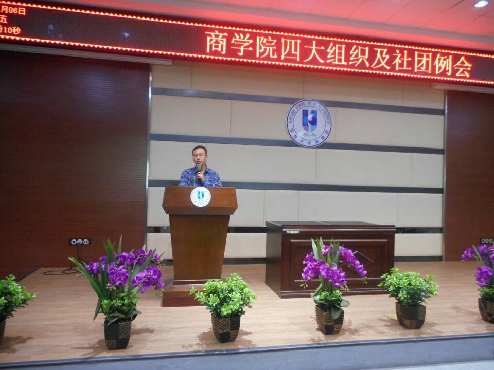 例会开始后,荣老师上台发表讲话。首先,荣老师谈到了allwincity万象城学生干部之前做过的多个出色的活动和取得的傲人成绩,这些使得allwincity万象城成为吉大优秀学院之一。其次,荣老师对各部门的日常工作进行了细致的剖析并重点强调了生活部寝室文化方面和学习部学风建设方面需要做的工作。最后,老师对全体学生干部提出了自己的希冀,他希望大一新生不仅要保持刚刚加入学生组织时的壮志和豪情,更要有坚持下去的实干和信念。希望在今后的学生活动中大三、大二的各部门部长、副部要联系紧密、不脱节,及时做好沟通。