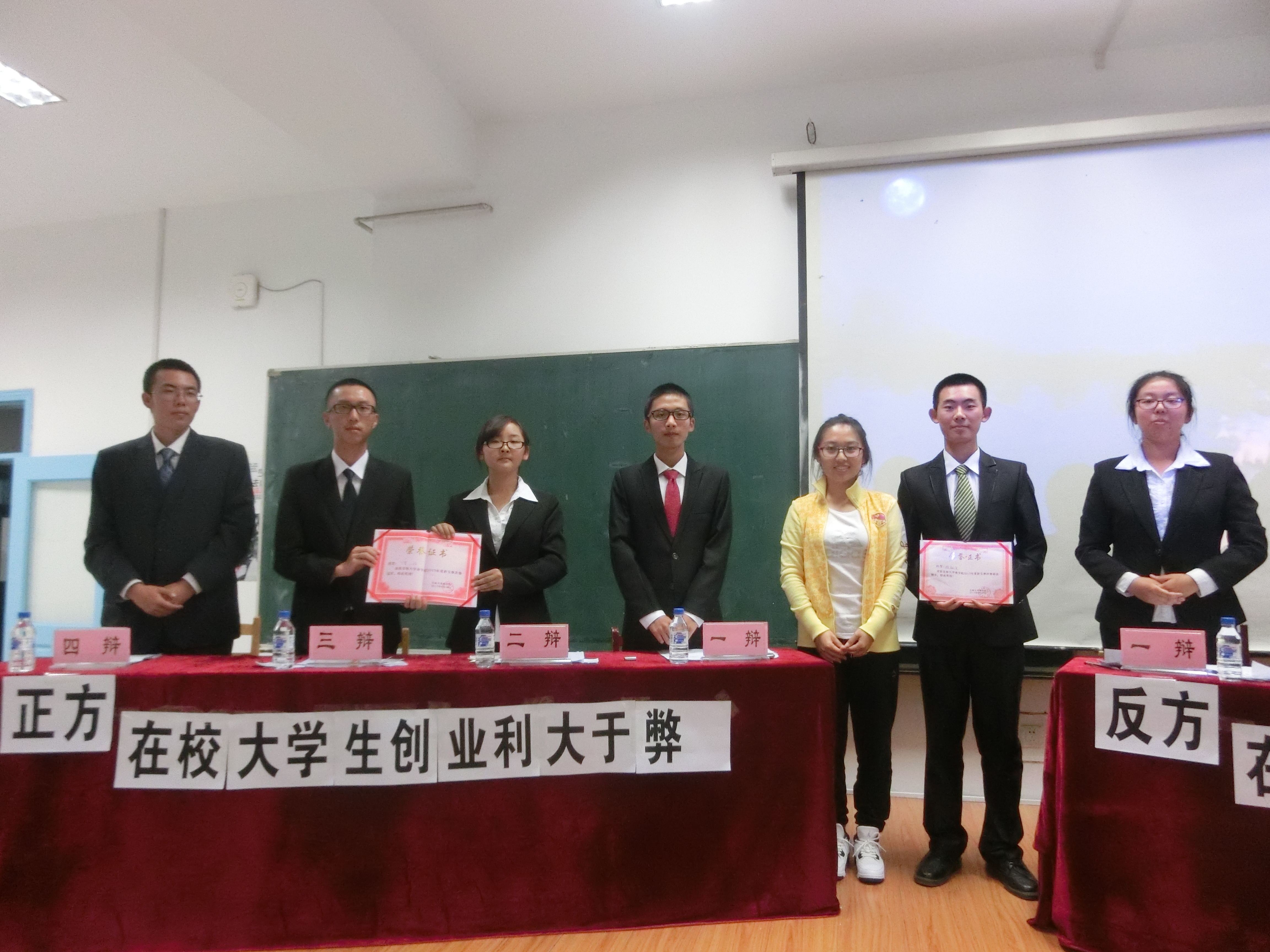 荆艳同学在最后对双方表现进行总结,赞扬了他们的闪光点,同时也对他们的不足提出了建议。最后,由金博老师为正方颁奖,祝贺他们取得最后的胜利。