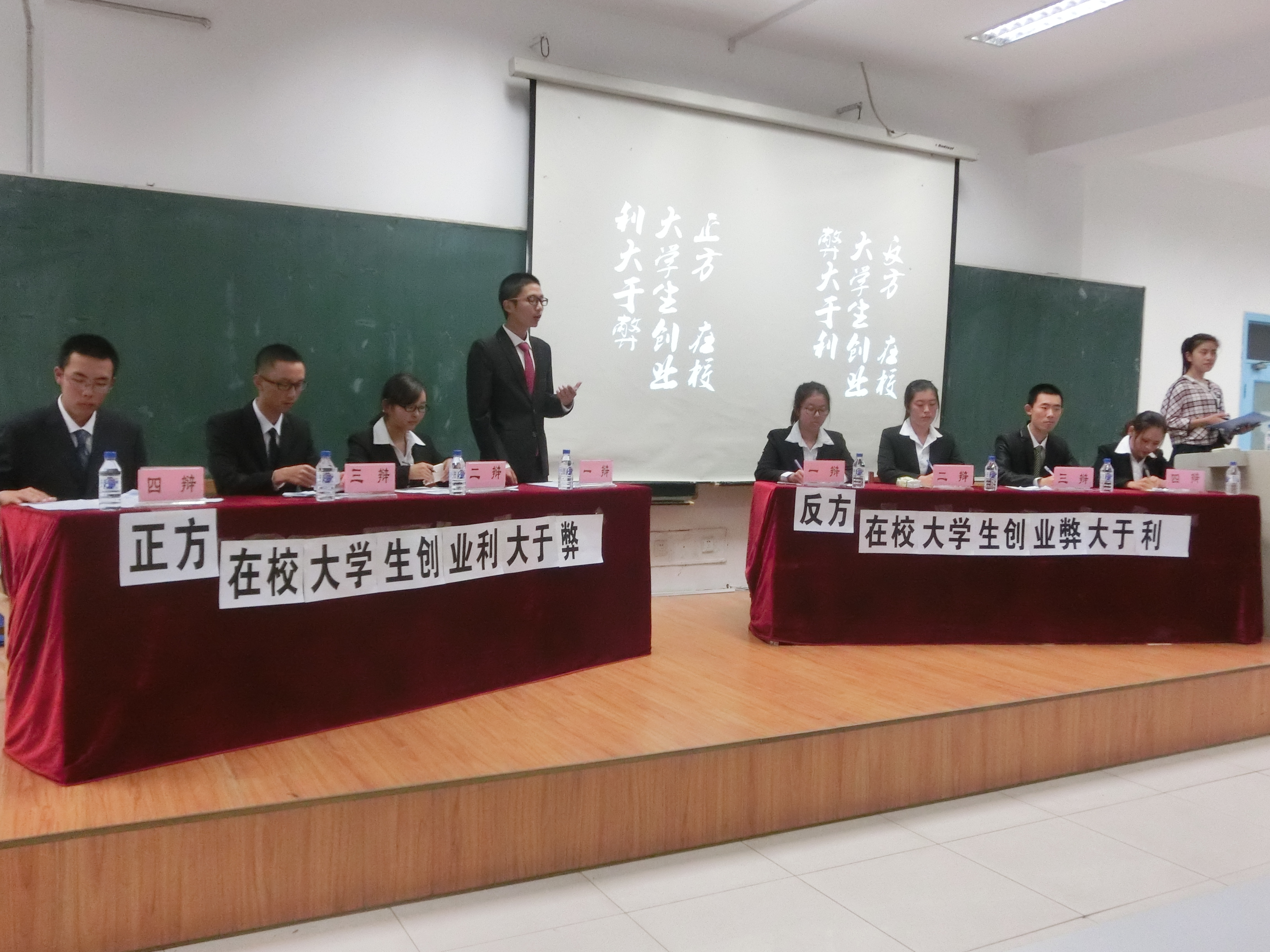 在同学们的期盼与等待中,比赛拉开帷幕。此次辩论赛的辩题是在校大学生创业是利大于弊还是弊大于利。开篇立论,正方一辩坚定着本方立场,以论点为出发点,向外扩散,着眼于创业为同学带来的实战经验,强调经验对于同学们未来学习生活的重要性。反方一辩则立足于大学时期是同学们走向社会的一个过渡,大家应该先学好文化知识,不必过早地接触社会。