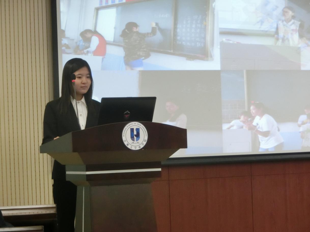 在展示过后,金博老师对此次活动予以总结,她赞扬了商院学子服务社会的行为,同时也表示希望商院学子能够将这一份回报社会的心传承下去,将“勤学、修德、明辨、笃行”的精神永远发扬下去。大会最后,金老师为在此次社会实践中表现突出的团队颁发了奖状。