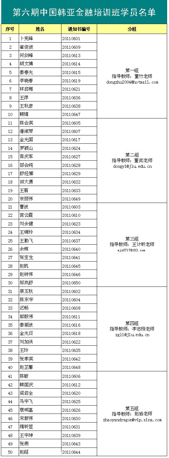 第六期中国韩亚金融培训班录取及分组名单已经确定,共计录取50人,分组5个学习小组,每组10人,每组一位指导教师。详情请见附件: