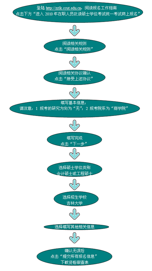 2010年在职人员攻读硕士学位考试网上报名于2010年7月2日--12日进行,现场确认时间为2010年7月16日--19日,考试时间为2010年10月30日--31日,现正进入网上报名的关键时期,特将网上报名流程整理公布如下,以供各位考生参考。