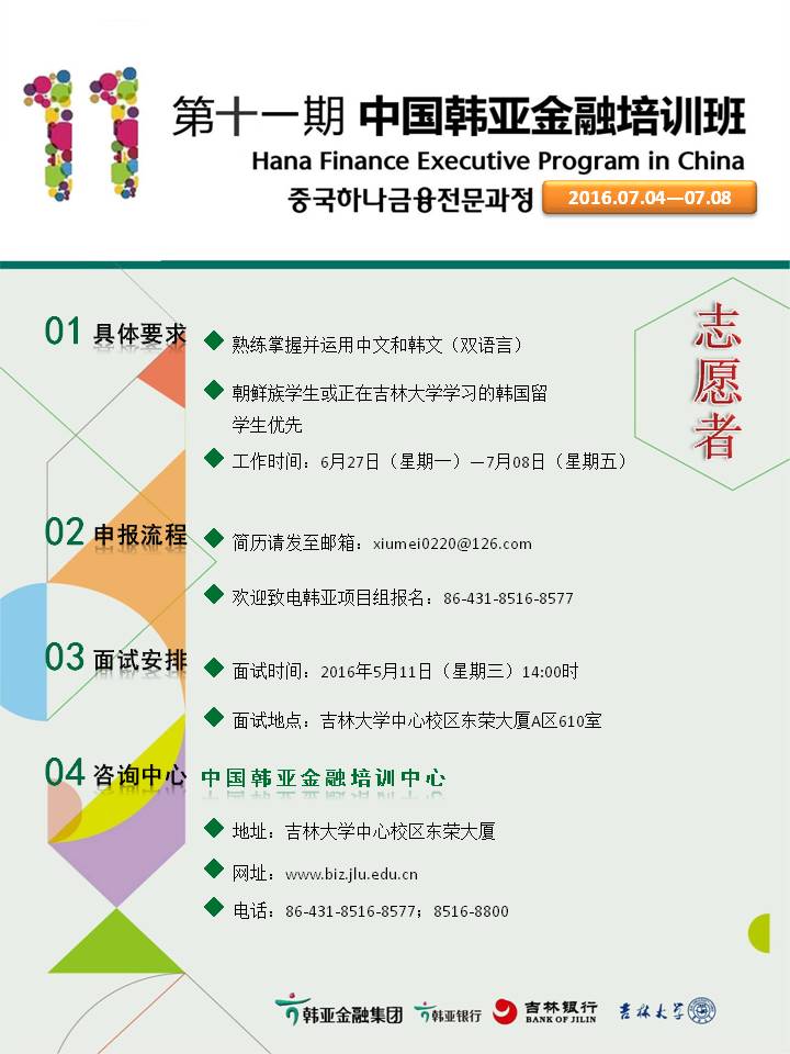 第十一期中国韩亚金融培训班将于201674日正式开始,现面向各位同学招募志愿者。具体要求如下: